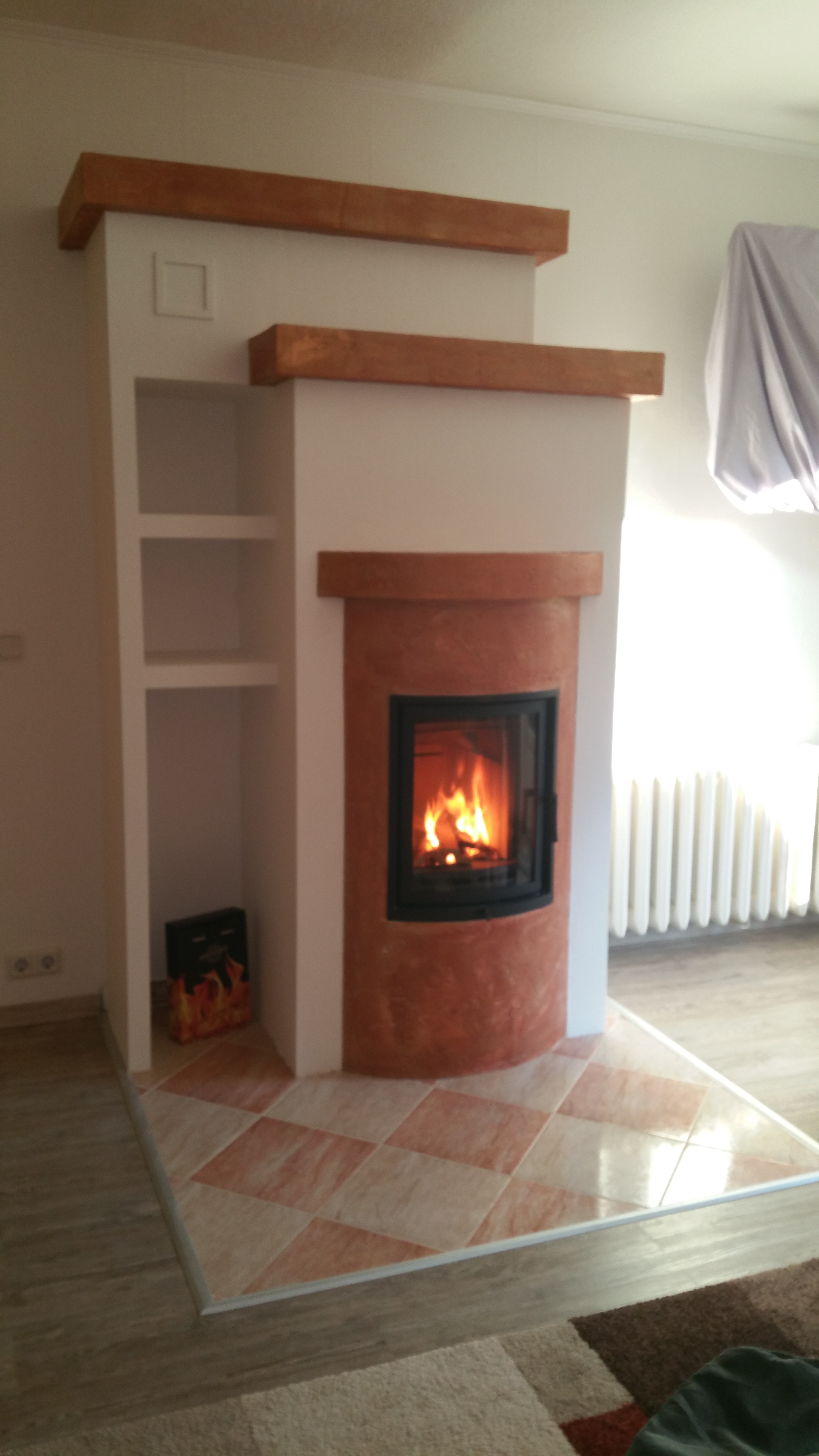 Das ist ein Kombiofen mit gemauerten Zügen oberhalb des Einsatzes er heizt die dahinterliegenden Räume mit. Die weie Oberfläche ist gespachtelt . Die grauen Flächen ist Mineralischer Wandputz in Kreativtechnik. Rechts vom Ofen steht der Schornstein. Diesen habe ich mit einer Sgraffito Technik verschönert (Es handelt sich um eine Dekorationstechnik zur Bearbeitung von Wandflächen. Nach der Auflage verschiedenfarbiger Putzschichten